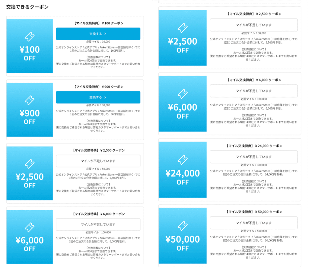 なので、Ankerオンラインストアや直営店で大きな買い物をするほどお得になりますね。還元率が高くなる場合、特に最大50万マイルだと5万円のクーポンで10%還元になります。ここまでの領域になると、Amazonで安く購入するよりお得になりますね。(ただし現実的ではない!)